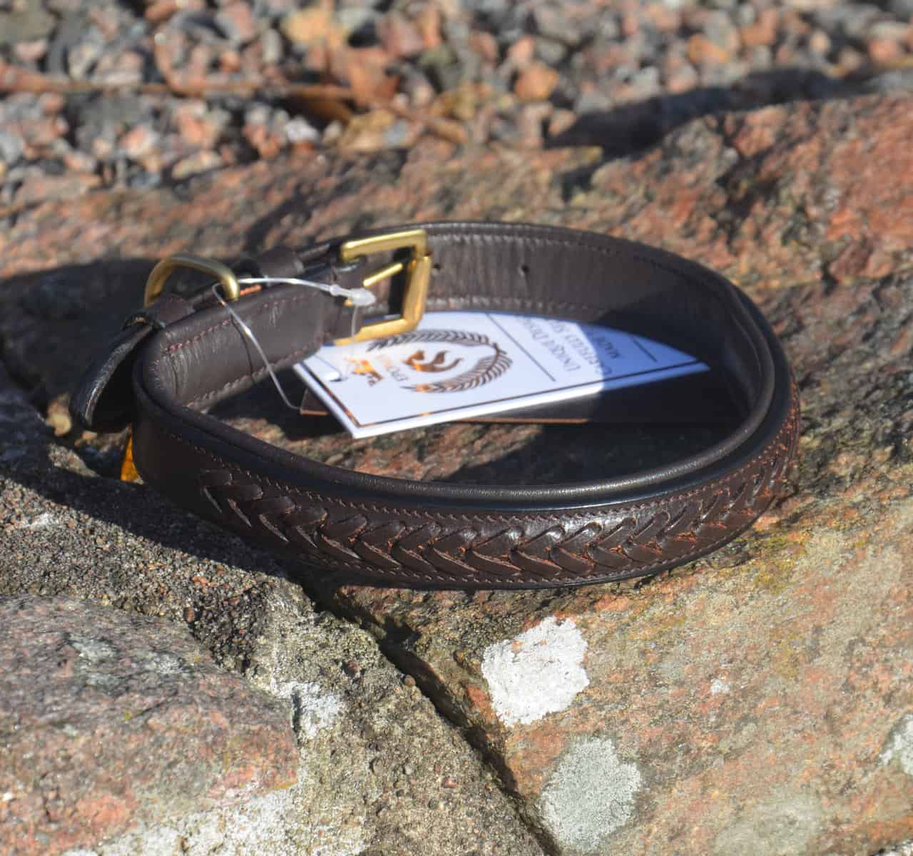 A country or city classic. Available in black with stainless steel or in brown with pale golden brass fittings. Sizes 35,45, or 55 cm. Measures are actual neck size the total length is longer for buckling.